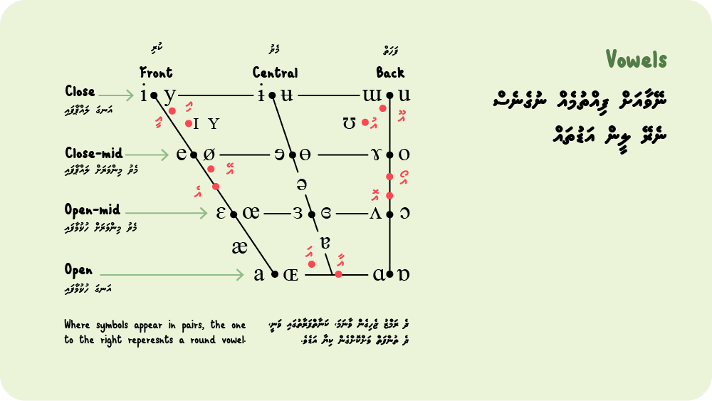 ދިވެހިބަހުގައި ހިމެނެނީ ލީން 10 ފޯނީމެވެ. އެ ފޯނީމުތަކަކީ އަ–އާ–އި–އީ–އު–އޫ–އެ–އޭ–އޮ–އޯ އެވެ. އަދި ތިރީގައިވާ ޗާޓުން ލީން އަޑުތައް ނެރޭ ޖަގަހަތައް ބަަލައި ލާށެވެ.